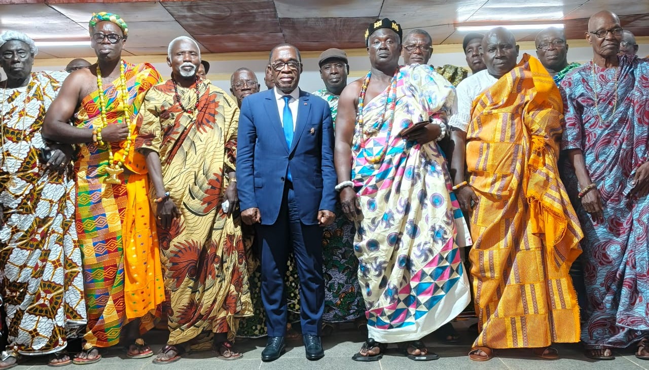 Légende photo : Le président du Conseil régional, Eugène Aka Aouélé, (en costume bleu au milieu) veut lutter contre l’orpaillage illégal dans le Sud-Comoé avec l’appui de la chefferie traditionnelle (Ph : SKD)