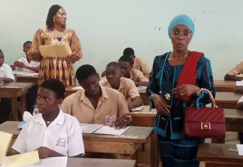 Légende photo : La Drenaet, Sidonie N’Goran Diomandé (au fond à gauche) procède au lancement des examens blancs régionaux dans une salle de composition, en compagnie de la Cheffe de l’Apfc, Salimata Camara Kéita (Ph : SKD)