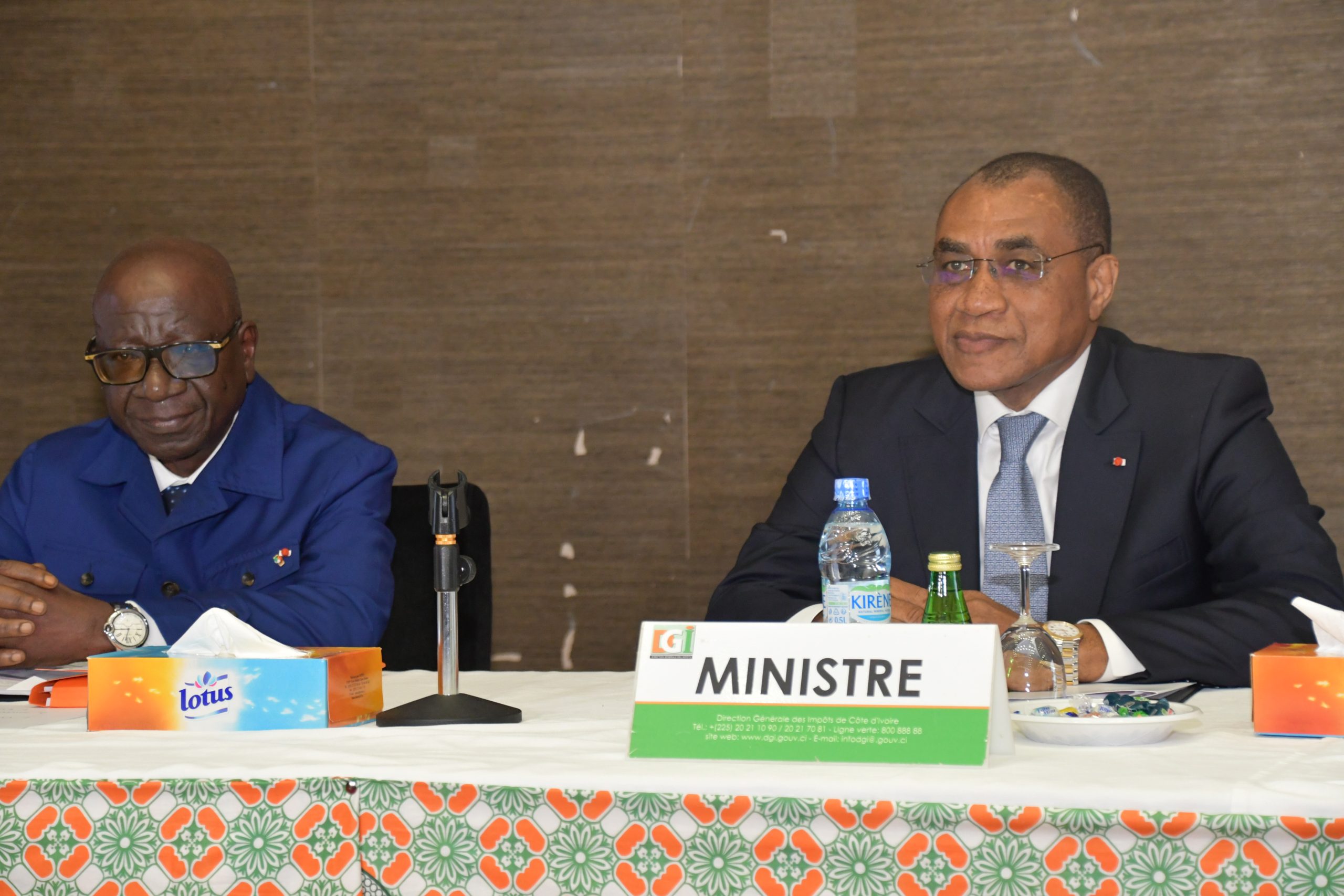 Le ministre Adama Coulibaly, à droite, veut une administration fiscale plus vertueuse. Assis à gauche, le directeur général de la DGI, Ouattara Sié Abou.