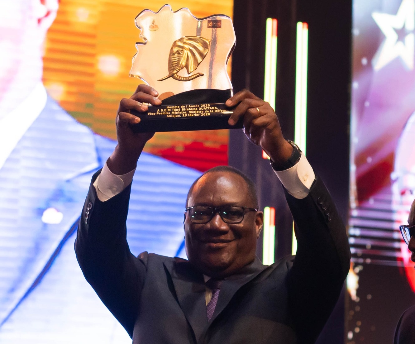 Légende photo : Le Vice-Premier ministre, ministre de la Défense, Téné Birhima Ouattara, brandissant son trophée d’«Homme de l’année 2025 ».