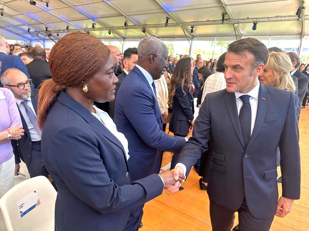 Légende photo : Le président français, Emmanuel Macron, saluant la ministre ivoirienne de l’éducation nationale et de l’alphabétisation, professeur Mariatou Koné.