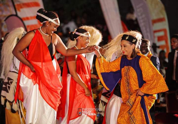 Légende photo : Les membres du Ballet national du Rwanda, pays invité spécial du MASA 2024, invitant la ministre ivoirienne de la culture et de la francophonie, Françoise Remarck, sur le podium.