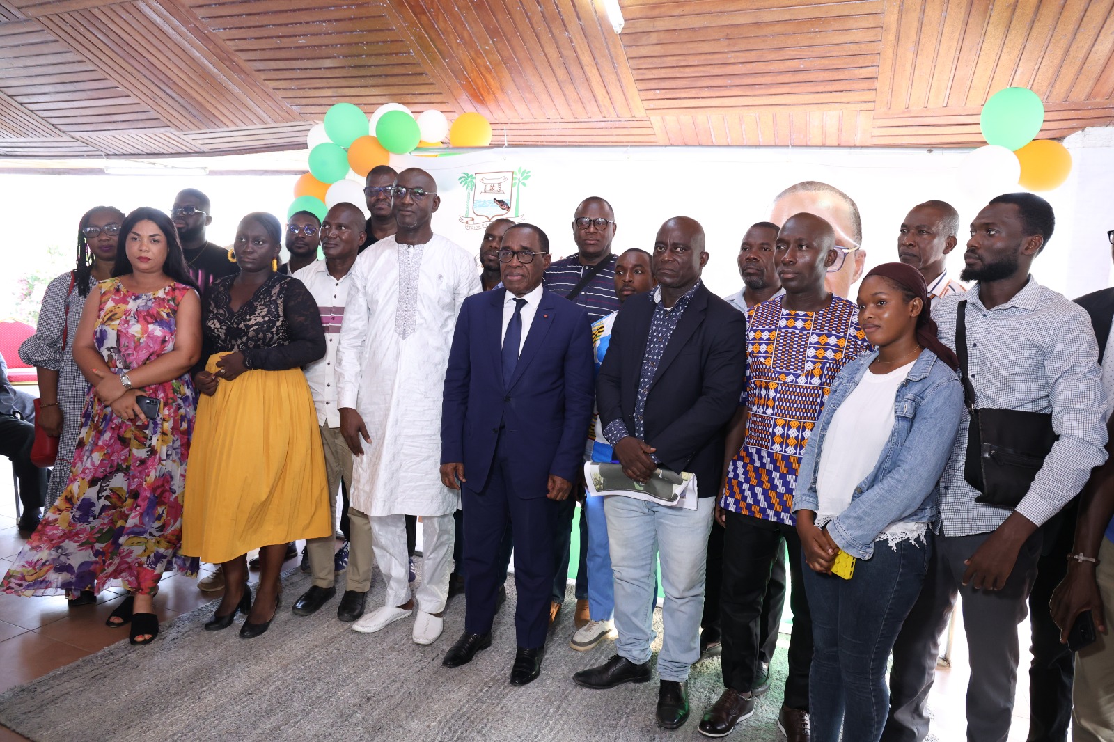 Légende photo : Les hommes de médias et le président Aka Aouélé (en costume au milieu) ensemble pour construire le Sud-Comoé de demain (Ph : SKD)